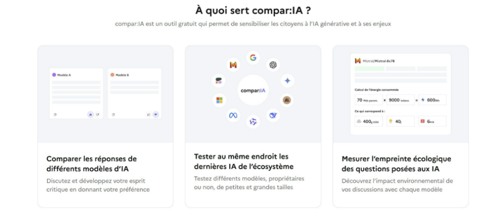 Compar:IA est un site proposé par le ministère de la culture. Cet outil gratuit permet de sensibiliser les citoyens à l’IA générative et à ses enjeux. Ce site vous permettra de partager vos avis sur les solutions IA et de comprendre l’efficacité et l’impact environnemental de vos discussions et de vos recherches.